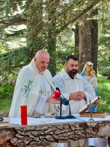 ثم ترأس الأب جوني سابا قدّاسًا إلهيًا في كنيسة التجلّي داخل الغابة، عاونه فيه الأب نيكولا عقيقي. واختتم اللقاء بغداء قروي في منزل الأب سابا وسط أجواء احتفالية مميزة. وقد جمع هذا اليوم بين الطبيعة والإيمان والوطنية والثقافة، وشكّل انطلاقة جديدة لمشروع يحمل لبنان إلى العالم.
