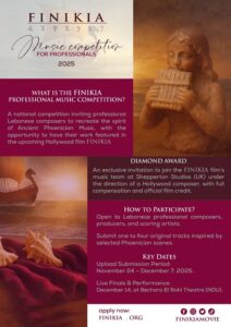 أعلنت اللجنة التحضيرية لفيلم “FINIKIA” عن إطلاق مسابقة جديدة مخصصة للموسيقيين المحترفين، بعد أسبوع تقريبًا على إطلاق مسابقة الناشئين. تهدف المسابقة إلى ابتكار مقطوعة موسيقية مستوحاة من الحضارة الفينيقية، لتصبح نواة الموسيقى التصويرية للفيلم، الذي سيُنتَج بالتعاون مع هوليوود على الشاطئ اللبناني.